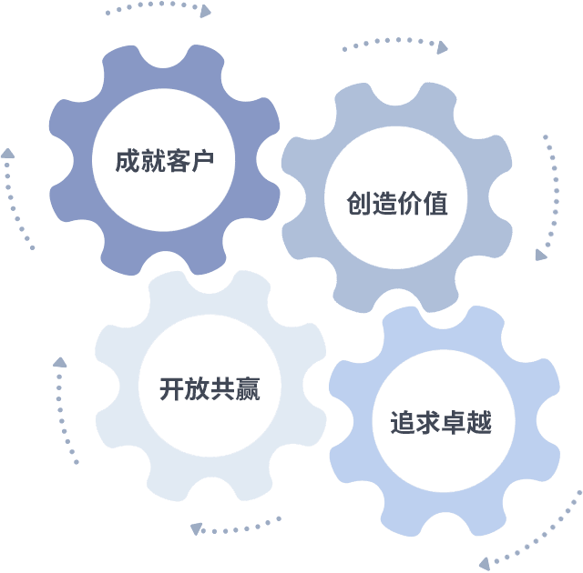 成就客户是一切决策的出发点,,创造价值是衡量所有工作的标准,,,,追求卓越是我们做事做人的态度,,,开放共赢是我们的格局也是最终的结果。。。。价值观的齿轮环环相扣,,,推动着组织里的每个人不断向前。。
