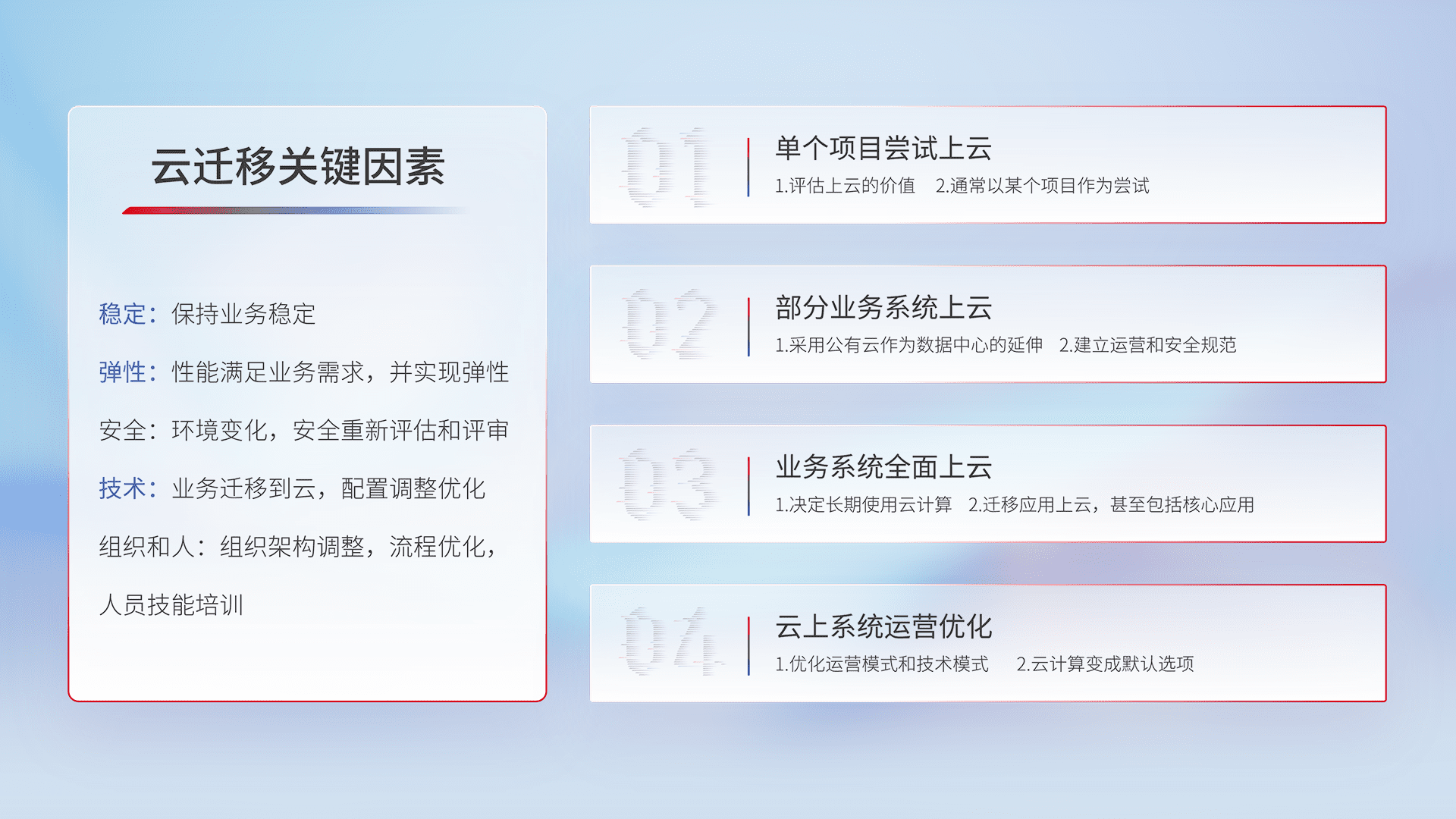结合实际业务,,,,从规划设计、、、云平台选型、、云原生改造、、、、数据迁移、、、、集成交付,,,迁移全过程为客户识别最佳上云路径,,,做好风险识别管理,,,,设计网络架构、、、、身份权限、、、安全审计合规、、、操作审计、、日志审计、、、监控告警策略、、、多站点容灾设计等,,,对云上基础设施进行整体规划,,,提升IT治理水平,,,以满足弹性、、、、高可用、、、、高性能的需求。。