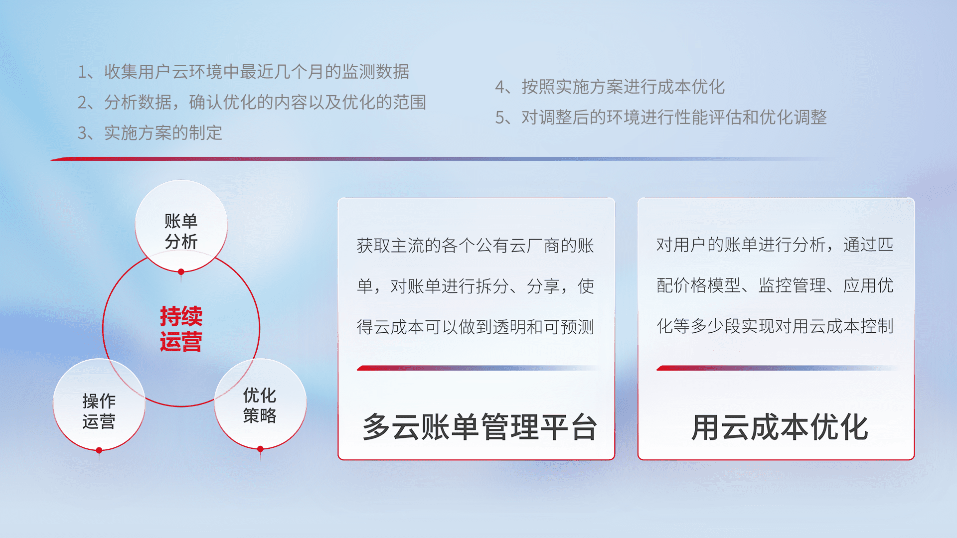 通过多云纳管,,以统一的资源数据模型把客户的云资源进行抽象和封装,,,,进而实现对多云资源的统一操作,,,,保障云资源管理的可靠性、、、稳定性与可用性。。。。量身定制化运维内容,,配置、、、、开发运维、、、补丁管理、、、、备份、、监控、、、认证和访问管理、、、审计和日常巡检等,,,,保障在用云过程中的可靠度,,,,稳定度以及高可用率。。。。