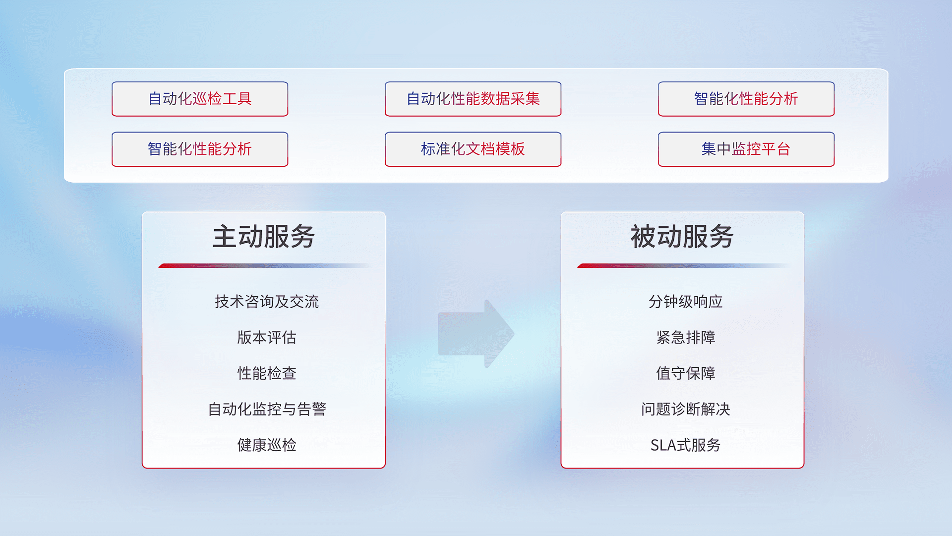智能化工具和标准化文档,,保障服务质量,,,提供主动服务(包含技术咨询、、、、版本评估、、性能检查、、、自动化监控与告警、、、健康巡检)和被动服务包含(分钟级响应、、紧急排障、、、、值守保障、、、问题诊断解决、、SLA服务)。。。。