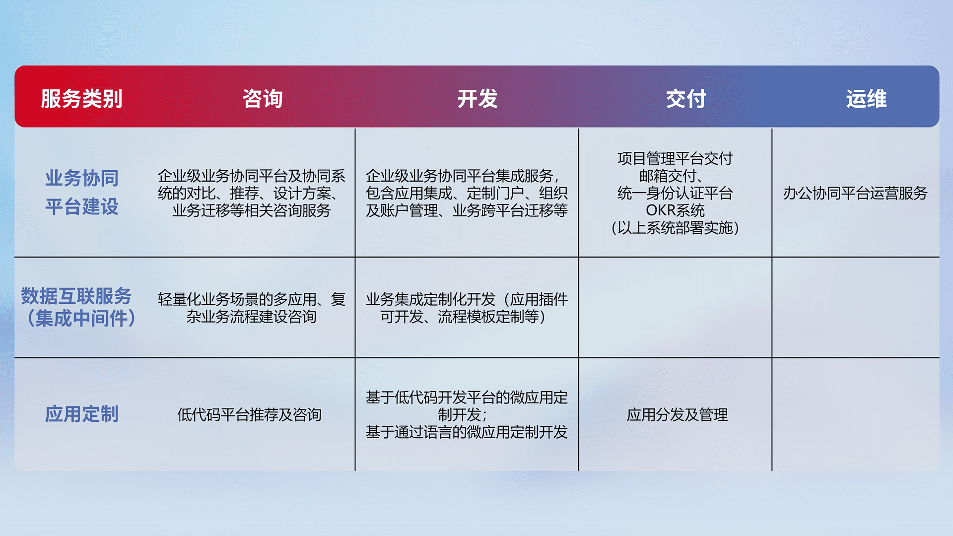 针对钉钉、、、、企微、、IDaas等平台级产品提供产品的规划、、方案、、、交付、、、、定制化开发等服务,,,实现如统一协同办公、、、智能客户服务、、混合会议管理、、智能数据查询、、、、等业务场景,,实现数字化转型。。